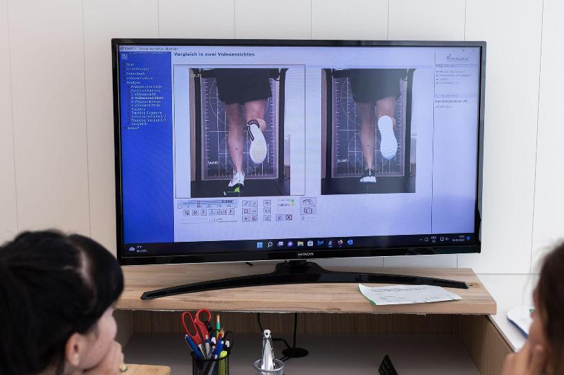 – Video analysis on the treadmill to assess the dynamic rolling behavior of the foot and the mechanical power transmission to the knees, hips, and pelvis while walking or jogging